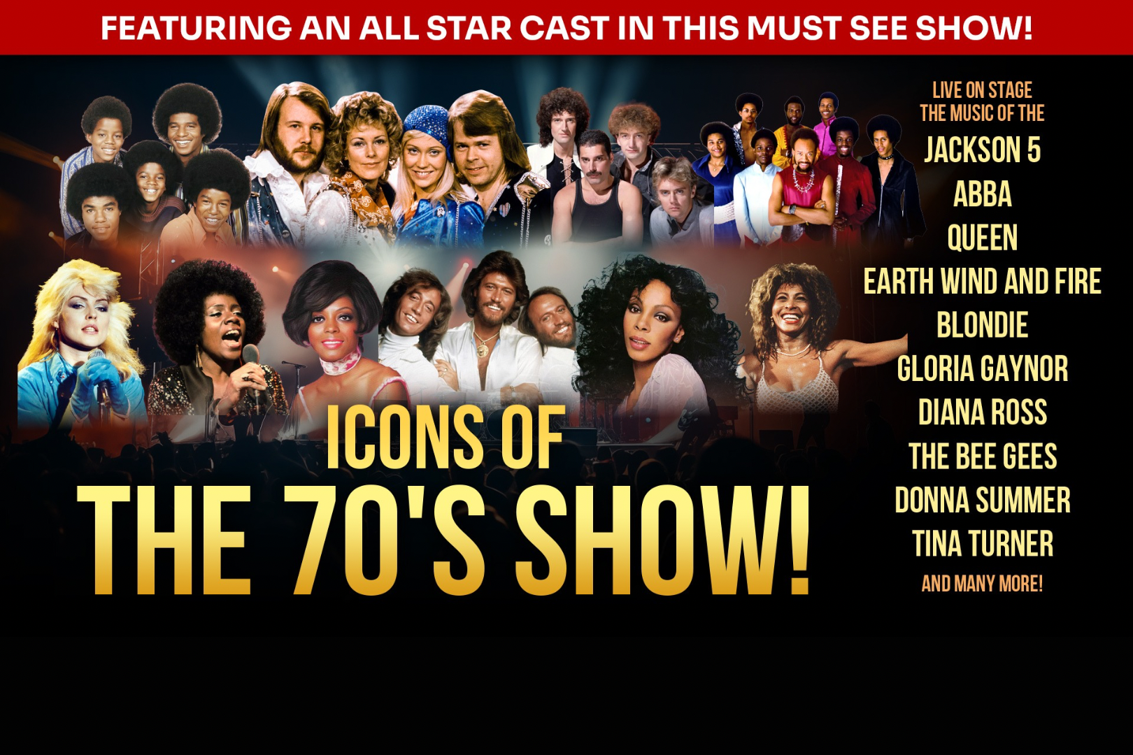 Get ready to boogie down memory lane with the ultimate live celebration of a golden era in music! The electrifying Icons of the 70’s Show! is rolling into town, bringing together an all-star cast to perform the unforgettable hits of the decade’s biggest superstars — live on stage!